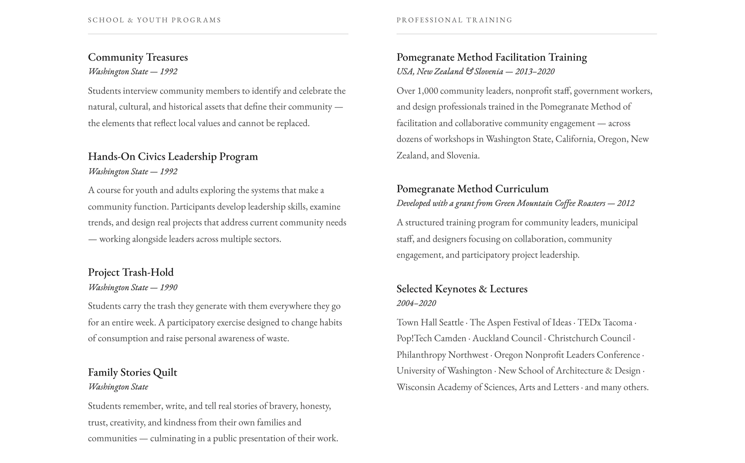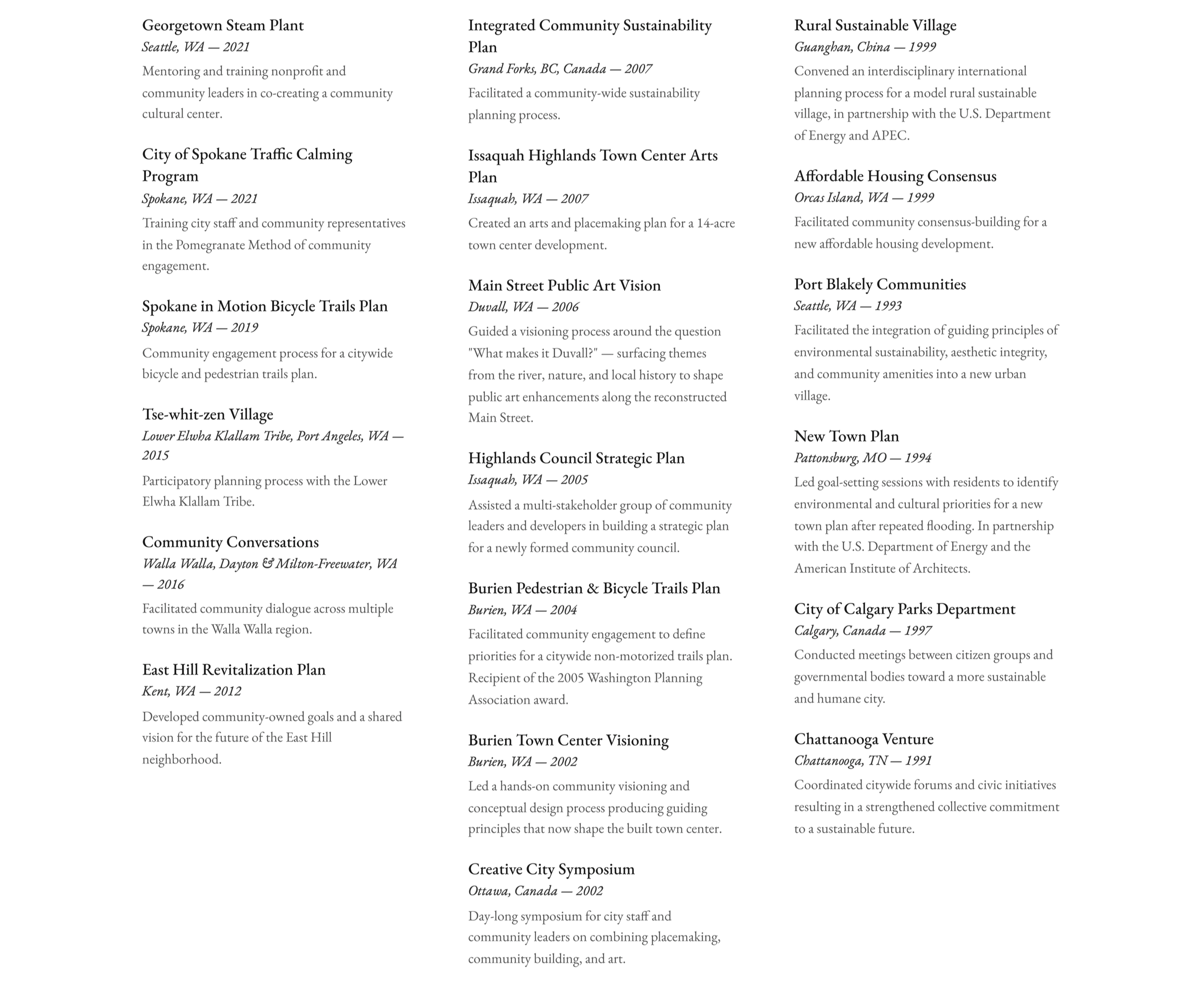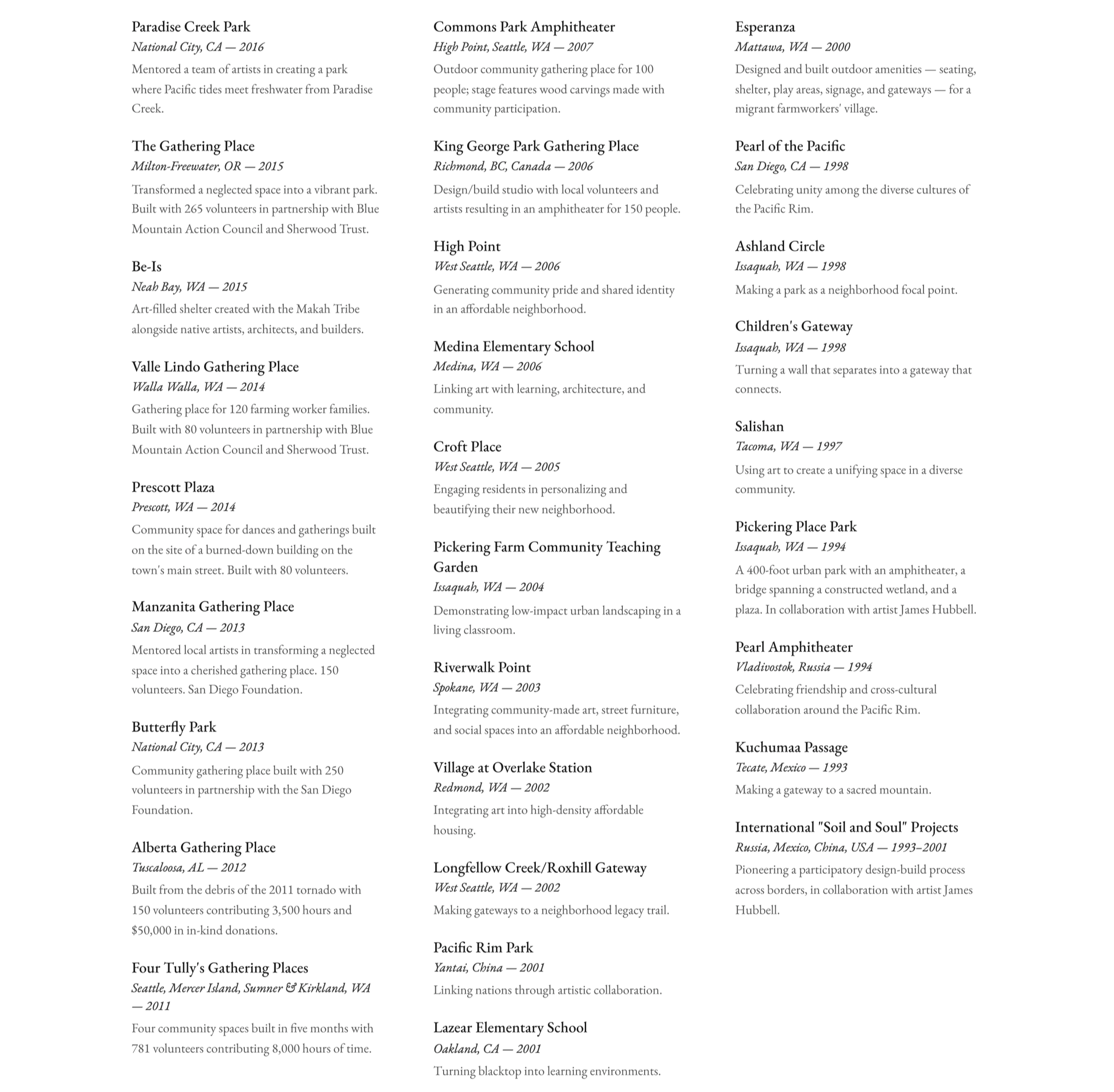 He collaborated on over 60 parks and gathering spaces around the Pacific Northwest and beyond, with artists, architects, craftspeople and builders including: James Hubbell, Chiaki Takanohara, Duncan Chalmers, Bree Dillon, Ilisa Goldman, Heinz Sodamin, Heidi Breeze-Harris, Paul Olson, Katya Matanovič, Amna Alvi, Paul Sorey, Deanna Goldy, Eric Higbee, and many others.