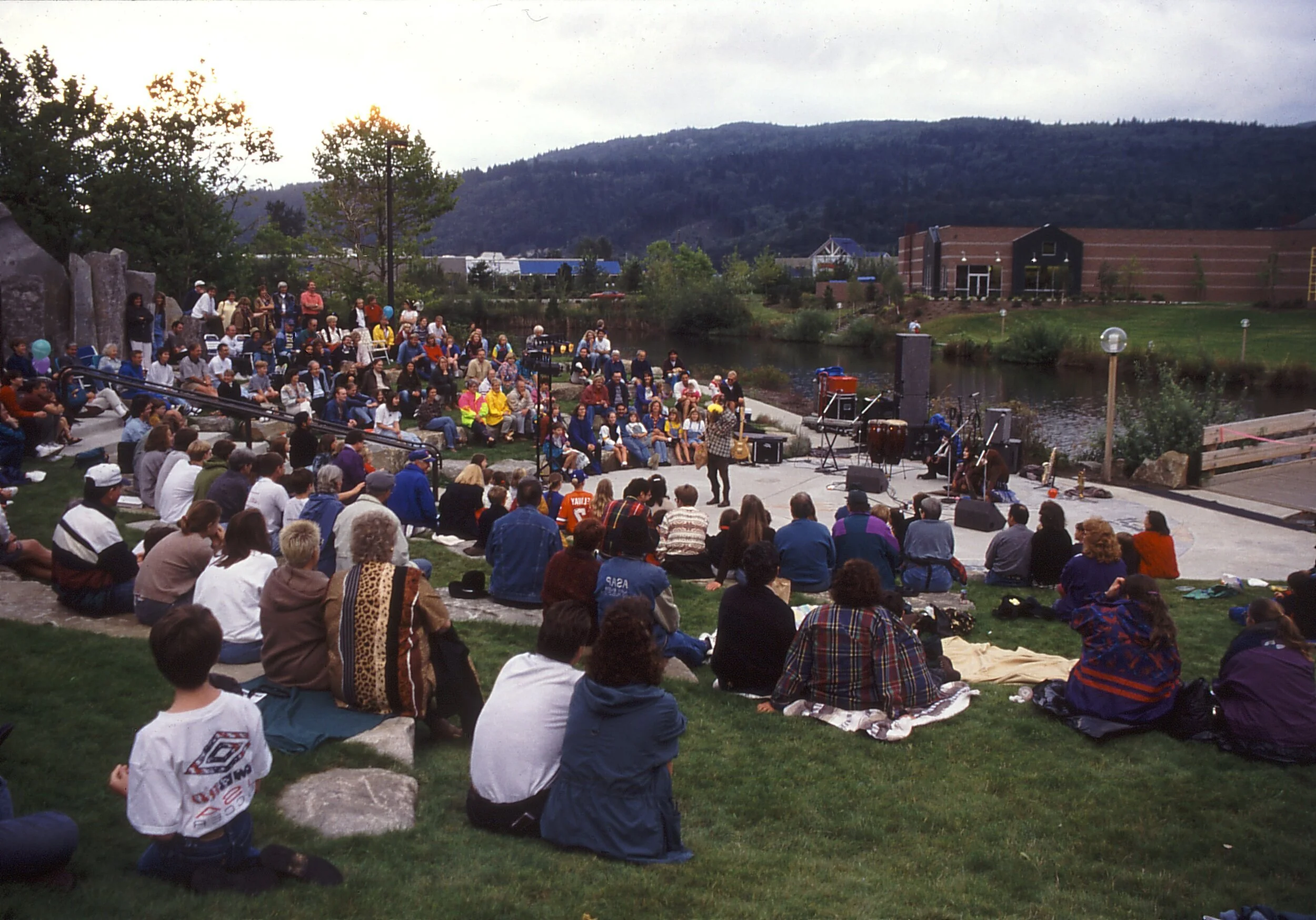 Build in 1995, Pomegranate Center designed Pickering Place Park to provide a focal point and pedestrian access between two previously disconnected commercial areas. The park features a 400-seat amphitheater, a fountain, two plazas, and a 120’ pedestrian bridge over a wetland. Mosaics depicting native wildlife dot the various pedestrian plazas. Monolithic granite stones decorated with modern “petroglyphs” Illustrate the history of the area and form a dramatic backdrop to the amphitheater which is used to stage festivals and community celebrations.